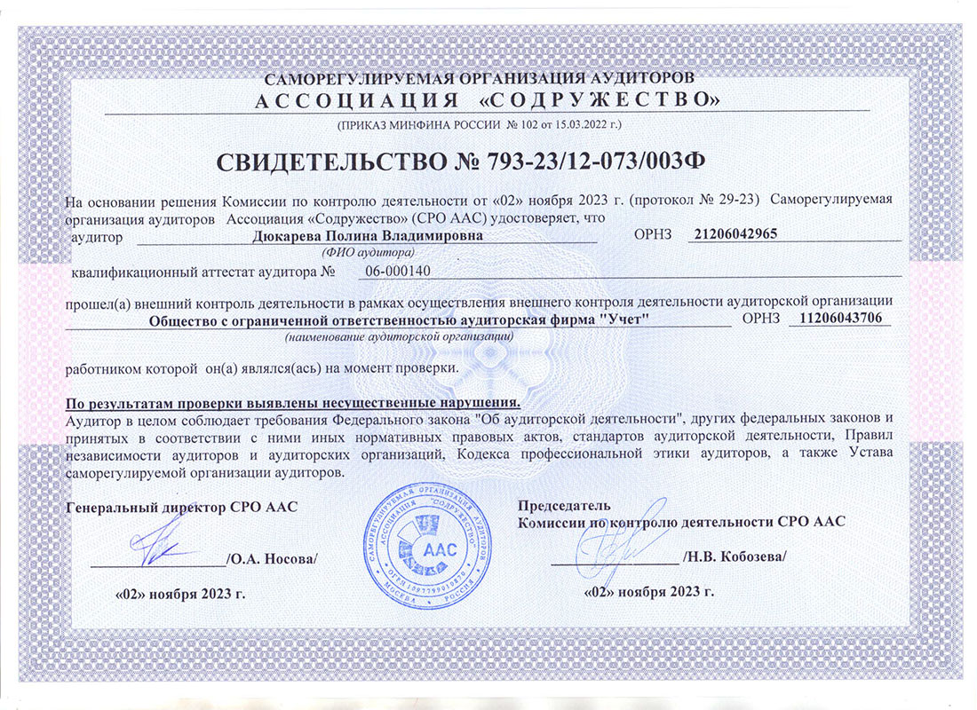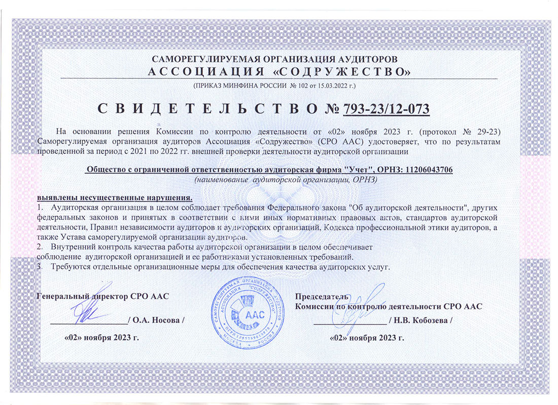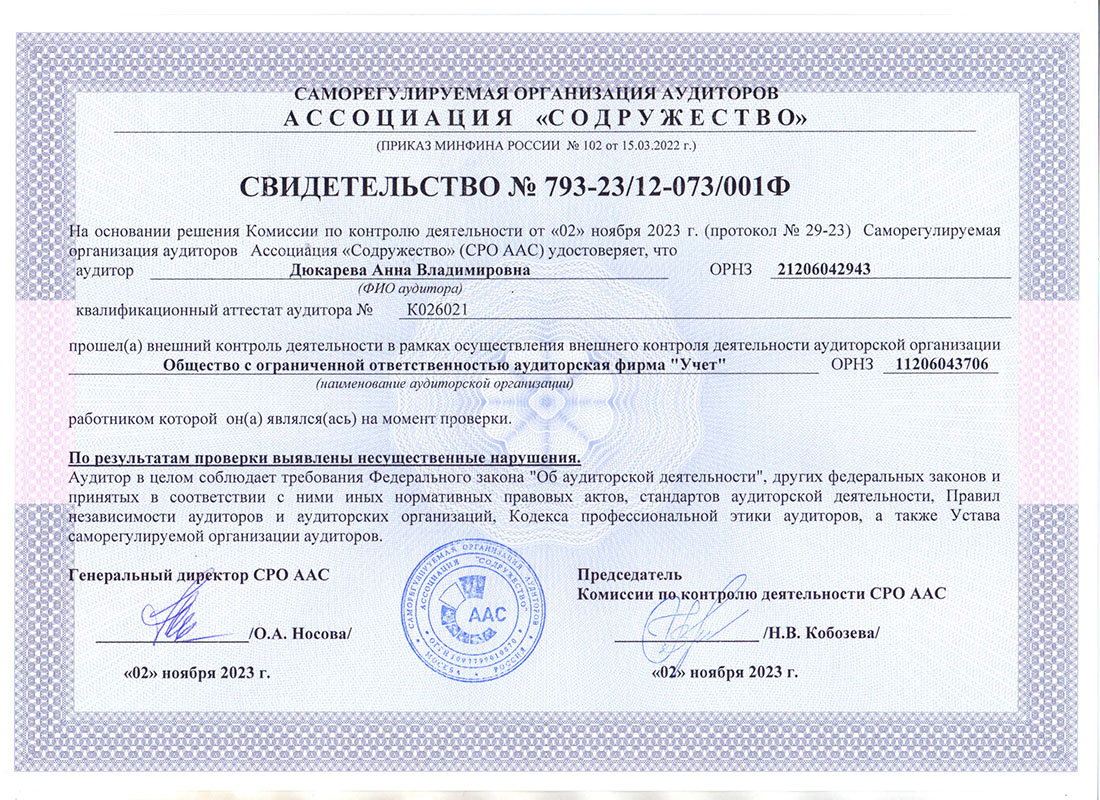 ООО аудиторская фирма «Учет» работает на российском рынке аудиторских услуг в г.Арзамас с 1996 года. ООО аудиторская фирма «Учет» является членом Саморегулируемой организации аудиторов Некоммерческое партнерство «Аудиторская ассоциация Содружество» (Свидетельство о членстве №5093 от 12.09.2012г. ОРНЗ 11206043706). В ООО аудиторская фирма «Учет» сформирован штат высококвалифицированных специалистов (в том числе 3 аттестованных аудиторов) в области аудиторских услуг, бухгалтерского и налогового законодательства, права и других, смежных с аудитом областей. Аудиторы фирмы проходят ежегодную переподготовку (40 часов). Кроме того, один из аудиторов имеет единый квалификационный аттестат, что даёт аудиторской фирме возможность проводить аудит организаций всех сфер деятельности и организационно-правовых форм